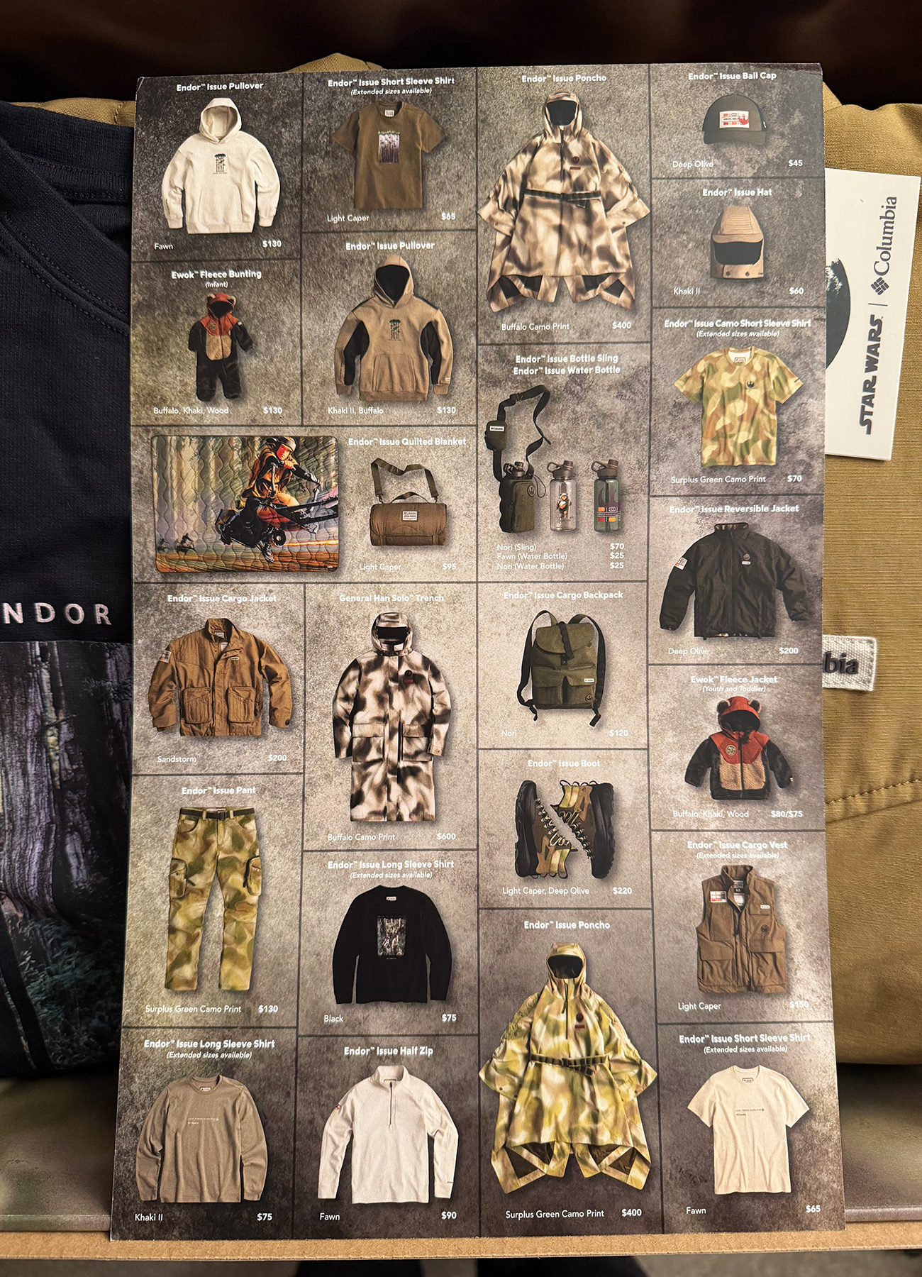 Columbia sent us the Endor Issue Cargo Jacket ($200), Endor Issue Pullover in Khaki II, Buffalo ($130), Endor Issue Half Zip ($90) and Endor Issue Long Sleeve Shirt ($75). The themed box included a one-sheet detailing all items in the collection as well as a few stickers. As in previous years, all the items include subtle Star Wars references.