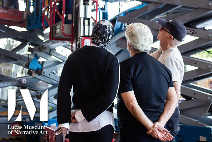 George Lucas and Mellody Hobson, co-founders of the Lucas Museum of Narrative Art, are looking at something big in the museum, but what is it? We have to wait till May 4th to find out. What do you think it is?
